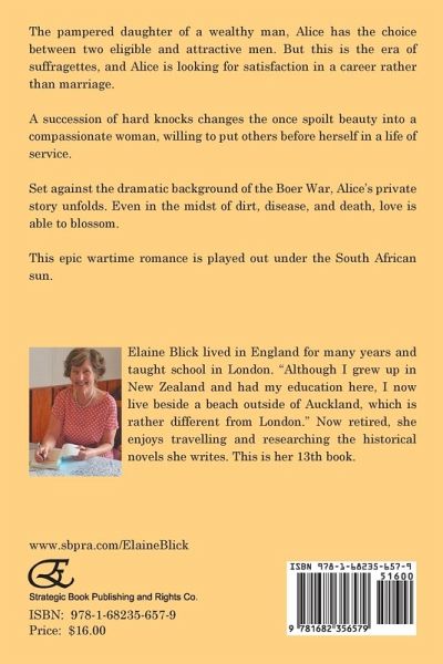 The pampered daughter of a wealthy man, Alice has the choice between two eligible and attractive men. But this is the era of suffragettes, and Alice is looking for satisfaction in a career rather than marriage.A succession of hard knocks changes the once spoilt beauty into a compassionate woman, willing to put others before herself in a life of service.Set against the dramatic background of the Boer War, Alice's private story unfolds. Even in the midst of dirt, disease, and death, love is able to blossom.This epic wartime romance is played out under the South African sun.(About the Author)Elaine Blick lived in England for many years and taught school in London. "Although I grew up in New Zealand and had my education here, I now live beside a beach outside of Auckland, which is rather different from London." Now retired, she enjoys travelling and researching the historical novels she writes. This is her 13th book.
