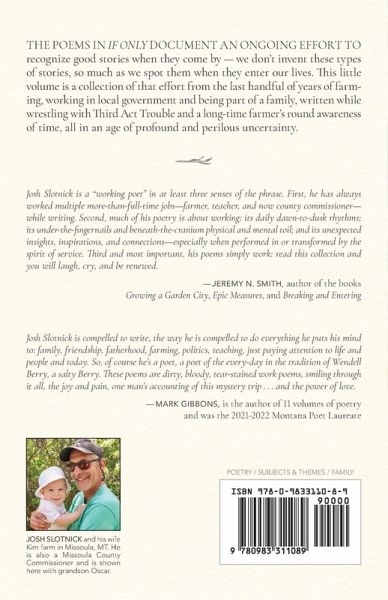 If Only documents an ongoing effort to recognize good stories when they come by - we don't invent these types of stories, so much as we spot them when they enter our lives. This little volume is a collection of that effort from the last handful of years of farming, working in local government and being part of a family, written while wrestling with Third Act Trouble and a long-time farmer's round awareness of time, all in an age of profound and perilous uncertainty.
