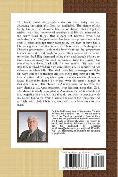 This book reveals the problems that we have today that are destroying the things that God has established. The picture of the family has been so distorted because of divorce, living together without marriage, homosexual marriage and lifestyle, transvestites, and many other things, that it does not resemble what God established at all. The government has been corrupt ever since it has been in place. Look at the horrible things the government has sanctioned down through the years. The treatment of the native Americans, by killing them and taking their land through trickery or force. Look at slavery, the most horrendous thing this country has ever done is enslaving black folks for two hundred fifty years, and after they received freedom they were still treated as inferior and not welcome by white folks. The church in America does not resemble the early church at all, weak preachers, who fear man more than God. The church is totally segregated in American, the white church still is so prejudice in the south.