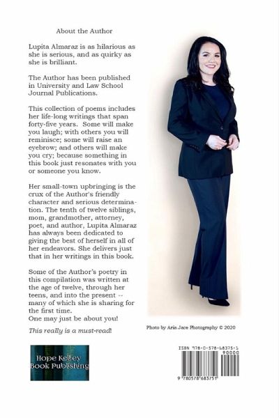 Lupita Almaraz Aguilar is as hilarious as she is serious, and as quirky as she is brilliant. The Author has been published in University and Law School Journal Publications. This compilation of poems includes her life-long writings that span forty-five years. Some will make you laugh; with others you will reminisce; some will raise an eyebrow; and others will make you cry; because something in this book just resonates with you or someone you know. Her small-town upbringing is the crux of the Author's friendly character and serious determination. The tenth of twelve siblings, a wife, mom, grandmother, attorney, poet, and author, Lupita Almaraz Aguilar has always been dedicated to giving the best of herself in all of her endeavors. She delivers just that in her writings in this book. Some of the Author's poetry in this collection was written at the age of twelve, through her teens, and into the present, many of which she is sharing for the first time. One may just be about you!