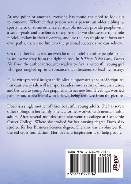 At one point or another, everyone has found the need to look up to someone. Whether that person was a parent, an older sibling, a sports hero, or some other celebrity, role models provide people with a set of goals and attributes to aspire to. If we choose the right role models, follow in their footsteps, and use their example to inform our own paths, there's no limit to the personal successes we can achieve. On the other hand, we can even be role models to other people--that is, unless we stray from the right course. In If There Is No Love, There's No Trust, the author introduces readers to Ava, a successful young girl who gets tangled up in a romance that threatens to lead her astray. Filled with practical insight and biblical support straight out of Scripture, this cautionary tale will transport readers into a story of success, status, and betrayal as young Ava grapples with her newfound feelings, worried parents, and a best friend who is slowly being removed from the picture. Doris is a single mother of three beautiful young adults. She has seven other siblings in her family. She is a former worked with mental health adults. After several months later, she went to college at Concorde Career College. Where she studied for her nursing degree Doris also studied for her Business Science degree. She also was a volunteer for the red cross foundation. Her love and inspiration is to help people.