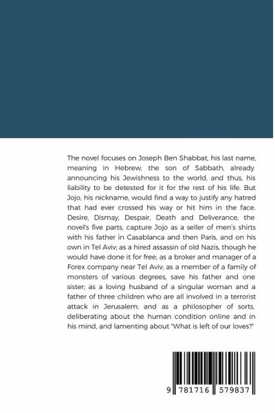 The novel focuses on Joseph Ben Shabbat, his last name meaning in Hebrew, the son of Sabbath, already announcing his Jewishness to the world, and thus, his liability to be detested for it for the rest of his life. But Jojo, his nickname, would find a way to justify any hatred that had ever crossed his way or hit him in the face. Desire, Dismay, Despair, Death and Deliverance, the novel's five parts, capture Jojo as a seller of men's shirts with his father in Casablanca and Paris, and on his own in Tel Aviv; as a hired assassin of old Nazis, though he would have done it for free; as a broker and manager of a Forex company near Tel Aviv; as a member of a family of monsters of various degrees, save his father and one sister; as a loving husband of a singular woman and father of three children who are all involved in a terrorist attack in Jerusalem; and as a philosopher of sorts, deliberating about the human condition online and in his mind, and lamenting about "What is left of our loves?"