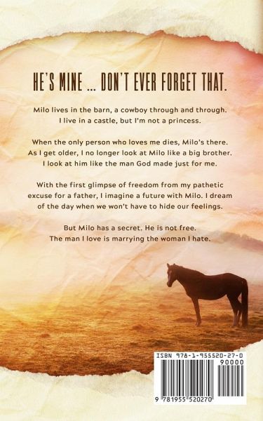 He's mine ... don't ever forget that. Milo lives in the barn, a cowboy through and through. I live in a castle, but I'm not a princess. When the only person who loves me dies, Milo's there. As I get older, I no longer look at Milo like a big brother. I look at him like the man God made just for me. With the first glimpse of freedom from my pathetic excuse for a father, I imagine a future with Milo. I dream of the day when we won't have to hide our feelings. But Milo has a secret. He is not free. The man I love is marrying the woman I hate.