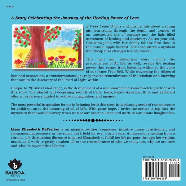 If Trees Could Sing is a whimsical tale about a young girl journeying through the depth and wonder of an unexpected rite of passage and the light-filled movement of healing and discovery. As ten year old, Christina joins with her family for the first time in the annual apple harvest; she encounters a mystical friendship that changes her life forever. This light and allegorical story depicts the preciousness of All life; as well, reveals the healing power that comes from listening within to the voice of our Inner True Self. While traversing the ridges of loss and separation, a transformational journey invites remembrance of the wisdom and knowing that awaits the discovery of the Pearl of Light within. Unique to If Trees Could Sing, is the development of a nine-movement soundtrack to partner with this story. The playful and deepening sounds of Celtic harp, Native American flute and keyboard offer an experience guided to activate imagination and imagery. The most powerful inspiration for me in bringing forth this story is in planting seeds of remembrance for children, as to the honoring of all of Life. With great hope, I invite the seeker to tap into the mysteries that await discovery when we use our heart to listen and nurture our innate imagination.