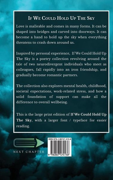 Love is malleable and comes in many forms. It can be shaped into bridges and carved into doorways. It can become a hand to hold up the sky when everything threatens to crash down around us. Inspired by personal experience, If We Could Hold Up The Sky is a poetry collection revolving around the tale of two neurodivergent individuals who meet as colleagues, fall rapidly into an iron friendship, and gradually become romantic partners. The collection also explores mental health, childhood, societal expectations, work-related stress, and how a solid foundation of support can make all the difference to overall wellbeing. This is the large print edition of If We Could Hold Up The Sky, with a larger font / typeface for easier reading.