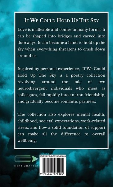 Love is malleable and comes in many forms. It can be shaped into bridges and carved into doorways. It can become a hand to hold up the sky when everything threatens to crash down around us. Inspired by personal experience, If We Could Hold Up The Sky is a poetry collection revolving around the tale of two neurodivergent individuals who meet as colleagues, fall rapidly into an iron friendship, and gradually become romantic partners. The collection also explores mental health, childhood, societal expectations, work-related stress, and how a solid foundation of support can make all the difference to overall wellbeing.