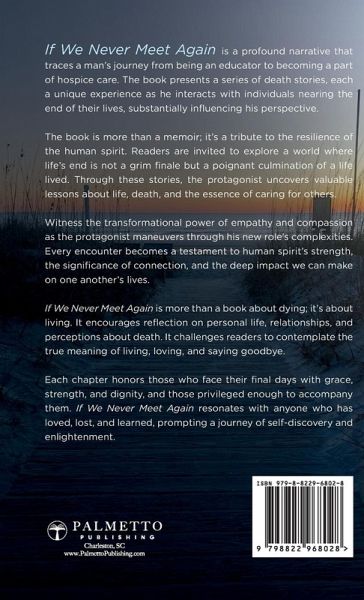 Embark on a Touching Journey: Lessons Learned from Hospice - A Chronicle of Life's Final Chapters Through the Eyes of a Dedicated Educator. In If We Never Meet Again, you will be taken on a profound journey of love, loss, and learning. This is the narrative of a man's pilgrimage from the confines of a classroom to the emotionally charged environment of hospice care. It chronicles his experiences as he steps in and out of the lives of individuals at the end of their own life journeys. Along the way, he encounters an array of unique "death stories," each one leaving a profound impact on him. The book provides more than just a memoir of experiences; it serves as a testament to the human spirit and its resilience. As you delve into its pages, you'll find yourself immersed in a world where the end of life is not seen as a bleak finale, but rather a poignant culmination of a life lived. It is through these stories that the protagonist learns invaluable lessons about life, death, and what it truly means to care for others. Witness the transformative power of compassion and empathy as the protagonist navigates the complexities of his new role. Each encounter is a testament to the strength of the human spirit, the power of connection, and the profound impact we can have on each other's lives. If We Never Meet Again is not just a book about death and dying. It is a book about life and living. It will make you reflect on your own life, your relationships, and the way you perceive death. It will challenge you to consider what it truly means to live, to love, and to say goodbye. In this touching narrative, every chapter is a tribute to those who live their final days with grace, strength, and dignity, and to those who are privileged enough to accompany them on this final journey. This is a book that will resonate with anyone who has ever loved, lost, and learned from the experience. Grab If We Never Meet Again today and embark on this moving journey of self-discovery and enlightenment.
