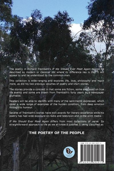 The poetry in Richard Trembath's If We Should Ever Meet Again cannot be described as modern or classical but where its difference lies is that it will appeal to and be understood by the common man. This collection is wide-ranging and explores life, love, philosophy and much more, as did his two previous volumes of poetry and short stories. The stories provide a contrast in that some are fiction, some are based on true life events and some are drawn from Trembath's forty years as a newspaper journalist. Readers will be able to identify with many of the sentiments expressed, which cover a wide range of examples of the human condition, from deep emotion through to humour. Several of Trembath's stories have won awards for literary excellence while his poetry has had wide exposure on radio and television and in the print media. If We Should Ever Meet Again differs from most collections of verse. Its straightforward approach to life as we all know it justifies it being classified as THE POETRY OF THE PEOPLE.