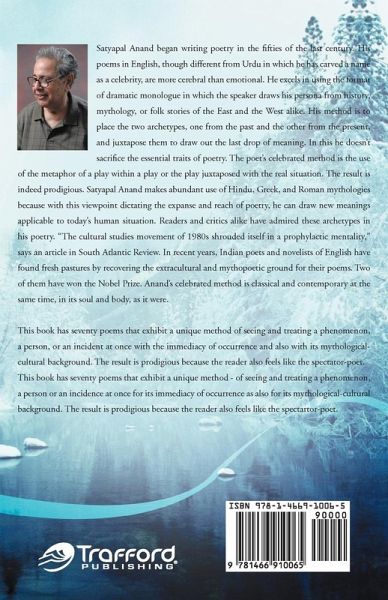 A compendium of seventy poems, this book is the fifth in a series of poetry books published by Satyapal Anand. His poetry, it has been said, is more cerebral than emotional. His poems reveal many splendored splashes of color and sound. The essential mythological self of humanity as a whole sparkles in these poems. His personae are all inside his poems. "Here" and "now" and "there" and "then" combine to create the timelessness of human psyche. There is a kind of double vision, the imagist's faculty for seeing a thing at once precisely for itself and also as a part of the bigger phenomenon. In the form of a dramatic monologue, the speaker and his speech reflect the time, place, thought, social conventions, and general circumstances. Of the seventy poems, there are twelve poems directly translated from Urdu. Calling Anand's poetry as "fresh breeze," the noted critic Caroline Greene says that nothing extraordinary has happened in American poetry in the past half a century, and if an Urdu poet of the stature of Satyapal Anand has brought his treasure house to us, it is likely to change the scenario here.