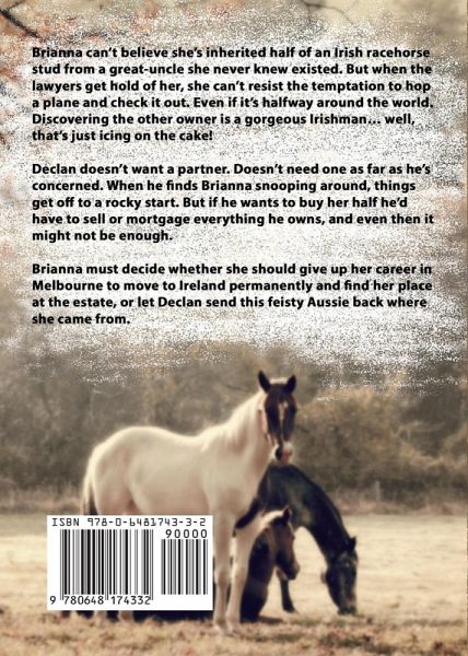 Brianna can't believe she's inherited half of an Irish racehorse stud from a great-uncle she never knew existed. But when the lawyers get hold of her, she can't resist the temptation to hop a plane and check it out. Even if it's halfway around the world. Discovering the other owner is a gorgeous Irishman… well, that's just icing on the cake! Declan doesn't want a partner. Doesn't need one as far as he's concerned. When he finds Brianna snooping around, things get off to a rocky start. But if he wants to buy her half he'd have to sell or mortgage everything he owns, and even then it might not be enough. Brianna must decide whether she should give up her career in Melbourne to move to Ireland permanently and find her place at the estate, or let Declan send this feisty Aussie back where she came from.