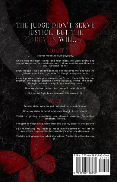 The judge didn't serve justice. But the Devils will. Violet I never meant to hurt anybody. Chloe was my best friend, and that night, we were drunk and stupid. We never backed down from a dare, and the one time she did, I wouldn't let her. Even though it was an accident, no one believes me. She was the girl everyone loved, and now I'm the girl everyone hates. I can't pretend their punishments don't hurt. Especially his. Her brother, the hockey captain I once called a friend. The man I thought, someday, might be something more. Now Wes hates me too. And he's not quiet about it. But I can't fight back. Because I deserve it all. Wes Before, Violet was the girl I wanted but couldn't have. Now, my sister is dead, and she's the girl I can't stand. Violet is getting everything she doesn't deserve. Protection. Freedom. Her life. She gets to keep living, even after she put my sister in the ground. So I'm enlisting my team to make every second of her life as miserable as possible. Because that's what she deserves. Violet is going to pay for what she's done. The Devils will make sure of it.
