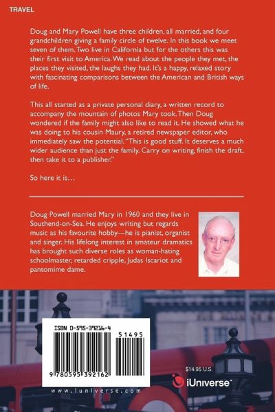 Doug and Mary Powell have three children, all married, and four grandchildren giving a family circle of twelve. In this book we meet seven of them. Two live in California but for the others this was their first visit to America. We read about the people they met, the places they visited, the laughs they had. It's a happy, relaxed story with fascinating comparisons between the American and British ways of life. This all started as a private personal diary, a written record to accompany the mountain of photos Mary took. Then Doug wondered if the family might also like to read it. He showed what he was doing to his cousin Maury, a retired newspaper editor, who immediately saw the potential. "This is good stuff. It deserves a much wider audience than just the family. Carry on writing, finish the draft, then take it to a publisher." So here it is.