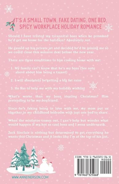 Should I have trusted my tyrannical boss when he promised he'd get me home for the holidays? Absolutely not. He gassed up his private jet and decided he'd be joining me so we could close this massive deal before the new year. There are three conditions to him coming home with me: 1. My family can't know that he's my boss (See note above about him being a tyrant) 2. I will absolutely be getting a big fat raise 3. He has to help me with my holiday wishlist What's worse than my boss stealing Christmas? Him pretending to be my boyfriend. Since he's faking being in love with me, my mom put us together in my childhood bedroom with just one bed to share. When the mistletoe comes out, I can't help but wonder what would happen if my hot as coal boss and I were underneath. Jack Sinclair is nothing but determined to get everything he wants this Christmas, and it looks like I'm at the top of his list. It's a small town, fake dating, one bed, spicy workplace holiday romance.