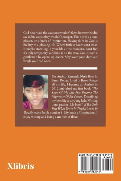 God never said the weapons wouldn't form,however he did say in his words they wouldn't prosper. This novel is a soul pleaser, it's a book of Inspiration. Having faith in God is the key to a pleasing life. Where faith is doubt can't exist. It maybe storming in your life at the moment, don't fret it's only temporary sunshine is on the way. God is such a gentleman he opens up doors. May your good days out weigh your bad ones.