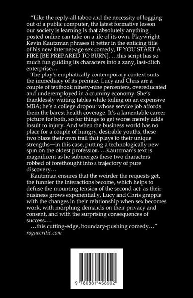 "Like the reply-all taboo and the necessity of logging out of a public computer, the latest formative lesson our society is learning is that absolutely anything posted online can take on a life of its own. Playwright Kevin Kautzman phrases it better in the enticing title of his new internet-age sex comedy, IF YOU START A FIRE [BE PREPARED TO BURN]. ...this script has so much fun guiding its characters into a zany, last-ditch enterprise... The play's emphatically contemporary context suits the immediacy of its premise. Lucy and Chris are a couple of textbook ninety-nine percenters, overeducated and underemployed in a crummy economy: She's thanklessly waiting tables while toiling on an expensive MBA; he's a college dropout whose service job affords them the barest health coverage. It's a lamentable career picture for both, so for things to get worse merely adds insult to injury. And when the business world has no place for a couple of hungry, desirable youths, these two blaze their own trail that plays to their unique strengths-in this case, putting a technologically new spin on the oldest profession. ...Kautzman's text is magnificent as he submerges these two characters robbed of forethought into a trajectory of pure discovery... Kautzman ensures that the weirder the requests get, the funnier the interactions become, which helps to defuse the mounting tension of the second act: as their business grows exponentially, Lucy and Chris grapple with the changes in their relationship when sex becomes work, with morphing demands on their privacy and consent, and with the surprising consequences of success.... ...this cutting-edge, boundary-pushing comedy..." roguecritic.com