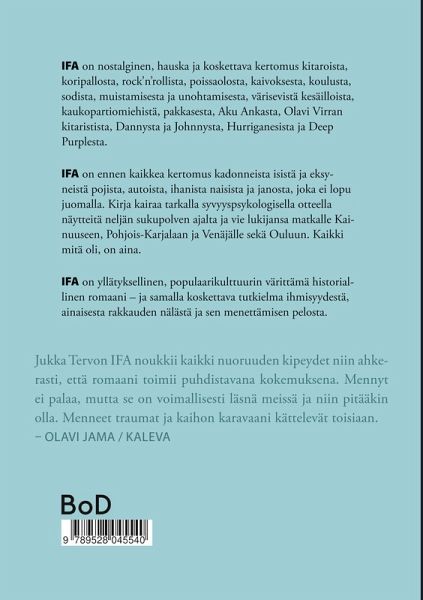 IFA on nostalginen, hauska ja koskettava kertomus kitaroista, koripallosta, rock'n'rollista, poissaolosta, kaivoksesta, koulusta, sodista, muistamisesta ja unohtamisesta, värisevistä kesäilloista, kaukopartiomiehistä, pakkasesta, Aku Ankasta, Olavi Virran kitaristista, Dannysta ja Johnnysta, Hurriganesista ja Deep Purplesta. IFA on ennen kaikkea kertomus kadonneista isistä ja eksyneistä pojista, autoista, ihanista naisista ja janosta, joka ei lopu juomalla. Kirja kairaa tarkalla syvyyspsykologisella otteella näytteitä neljän sukupolven ajalta ja vie lukijansa matkalle Kainuuseen, Pohjois-Karjalaan ja Venäjälle sekä Ouluun. Kaikki mitä oli, on aina. IFA on yllätyksellinen, populaarikulttuurin värittämä historiallinen romaani - ja samalla koskettava tutkielma ihmisyydestä, ainaisesta rakkauden nälästä ja sen menettämisen pelosta. Jukka Tervon IFA noukkii kaikki nuoruuden kipeydet niin ahkerasti, että romaani toimii puhdistavana kokemuksena. Mennyt ei palaa, mutta se on voimallisesti läsnä meissä ja niin pitääkin olla. Menneet traumat ja kaihon karavaani kättelevät toisiaan. Olavi Jama/Kaleva