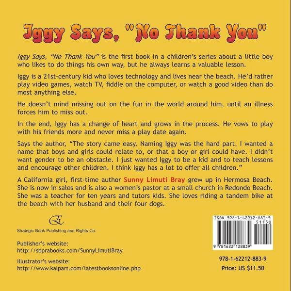 Iggy Says, "No Thank You" is the first book in a children's series about a little boy who likes to do things his own way, but he always learns a valuable lesson. Iggy is a 21st-century kid who loves technology and lives near the beach. He'd rather play video games, watch TV, fiddle on the computer, or watch a good video than do most anything else. He doesn't mind missing out on the fun in the world around him, until an illness forces him to miss out. In the end, Iggy has a change of heart and grows in the process. He vows to play with his friends more and never miss a play date again. Says the author, "The story came easy. Naming Iggy was the hard part. I wanted a name that boys and girls could relate to, or that a boy or girl could have. I didn't want gender to be an obstacle. I just wanted Iggy to be a kid and to teach lessons and encourage other children. I think Iggy has a lot to offer all children." A California girl, first-time author Sunny Limuti Bray grew up in Hermosa Beach. She is now in sales and is also a women's pastor at a small church in Redondo Beach. She was a teacher for ten years and tutors kids. She loves riding a tandem bike at the beach with her husband and their four dogs.