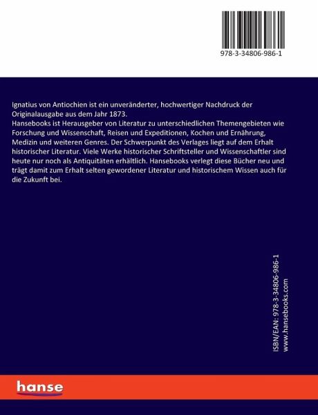 Ignatius von Antiochien ist ein unveränderter, hochwertiger Nachdruck der Originalausgabe aus dem Jahr 1873.Hansebooks ist Herausgeber von Literatur zu unterschiedlichen Themengebieten wie Forschung und Wissenschaft, Reisen und Expeditionen, Kochen und Ernährung, Medizin und weiteren Genres. Der Schwerpunkt des Verlages liegt auf dem Erhalt historischer Literatur. Viele Werke historischer Schriftsteller und Wissenschaftler sind heute nur noch als Antiquitäten erhältlich. Hansebooks verlegt diese Bücher neu und trägt damit zum Erhalt selten gewordener Literatur und historischem Wissen auch für die Zukunft bei.
