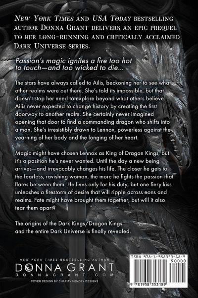 New York Times and USA Today bestselling author Donna Grant delivers an epic prequel to her long-running and critically acclaimed Dark Universe series. Passion's magic ignites a fire too hot to touch-and too wicked to die... The stars have always called to Ailis, beckoning her to see what other realms were out there. She's told its impossible, but that doesn't stop her need to explore beyond what others believe. Ailis never expected to change history by creating the first doorway to another realm. She certainly never imagined opening that door to find a commanding dragon who shifts into a man. She's irresistibly drawn to Lennox, powerless against the yearning of her body and the longing of her heart. Magic might have chosen Lennox as King of Dragon Kings, but it's a position he's never wanted. Until the day a new being arrives-and irrevocably changes his life. The closer he gets to the fearless, ravishing woman, the more he fights the passion that flares between them. He lives only for his duty, but one fiery kiss unleashes a firestorm of desire that will ripple across eons and realms. Fate might have brought them together, but will it also tear them apart? The origins of the Dark Kings/Dragon Kings and the entire Dark Universe is finally revealed.