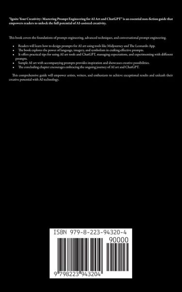 "Ignite Your Creativity: Mastering Prompt Engineering for AI Art and ChatGPT" is an essential non-fiction guide that empowers readers to unlock the full potential of AI-assisted creativity. This book covers the foundations of prompt engineering, advanced techniques, and conversational prompt engineering. Readers will learn how to design prompts for AI art using tools like Midjourney and The Leonardo App. The book explores the power of language, imagery, and symbolism in crafting effective prompts. It offers practical tips for using AI art tools and ChatGPT, managing expectations, and experimenting with different prompts. Sample AI art with accompanying prompts provides inspiration and showcases creative possibilities. The concluding chapter encourages embracing the ongoing journey of AI art and ChatGPT. This comprehensive guide will empower artists, writers, and enthusiasts to achieve exceptional results and unleash their creative potential with AI technology.