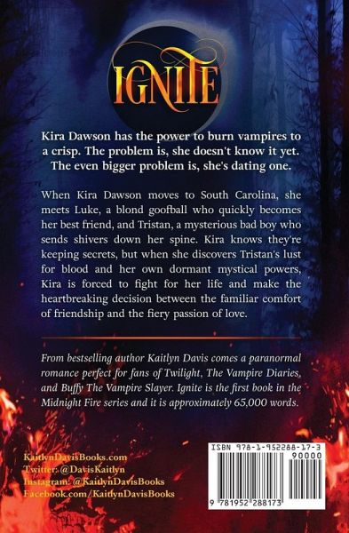 **Over 250,000 Copies of The Midnight Fire Series Sold!** **Over 2000 5-Star Reviews on Goodreads!** Kira Dawson has the power to burn vampires to a crisp. The problem is, she doesn't know it yet. The even bigger problem is, she's dating one. When Kira Dawson moves to South Carolina, she meets Luke, a blond goofball who quickly becomes her best friend, and Tristan, a mysterious bad boy who sends shivers down her spine. Kira knows they're keeping secrets, but when she discovers Tristan's lust for blood and her own dormant mystical powers, Kira is forced to fight for her life and make the heartbreaking decision between the familiar comfort of friendship and the fiery passion of love. From bestselling author Kaitlyn Davis comes a paranormal romance perfect for fans of Twilight, The Vampire Diaries, and Buffy The Vampire Slayer. Ignite is the first book in the Midnight Fire series and it is approximately 65,000 words.