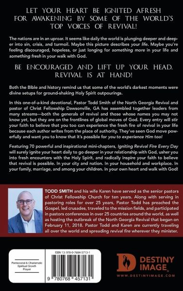 Featuring powerful, Holy Spirit-filled entries by Top Revival Leaders, including: Randy Clark - John and Carol Arnott - Dr. Michael L. Brown - James W. Goll - Pastor John Kilpatrick - David Hogan - Ward Simpson The nations are in an uproar. It seems like daily the world is plunging deeper and deeper into sin, crisis, and turmoil. Maybe this picture describes your life. Maybe you're feeling discouraged, hopeless, or just longing for something morein your life and something fresh in your walk with God. Be encouraged and lift up your head. Revival is at hand! Both the Bible and history remind us that some of the world's darkest moments were divine setups for ground-shaking Holy Spirit outpourings. In this one-of-a-kind devotional, Pastor Todd Smith of the North Georgia Revival and pastor of Christ Fellowship Dawsonville, GA has assembled together leaders from many streams-both the generals of revival and those whose names you may not know yet, but they are on the frontlines of global moves of God. Every entry will stir your faith to believe that you too can experience the fresh fire of revival in your life because each author writes from the place of authority. They've seen God move powerfully and want you to know that it's possible for you to experience Him too! ¿Featuring 70 powerful and inspirational mini-chapters, Igniting Revival Fire Everyday will surely ignite your heart daily to go deeper in your relationship with God, usher you into fresh encounters with the Holy Spirit, and radically inspire your faith to believe that revival is possible. In your city and nation. In your household and workplace. In your family, marriage, and among your children. In your own heart and walk with God!