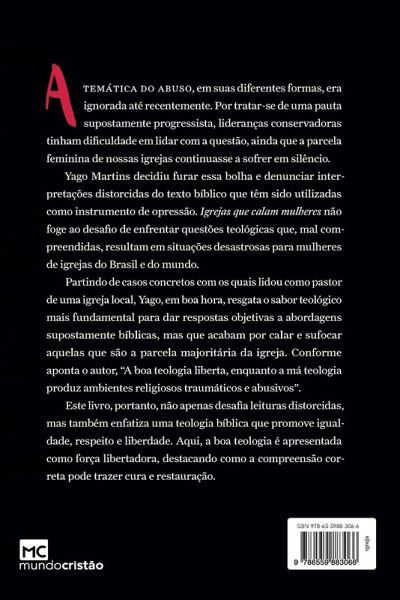 A temática do abuso, em suas diferentes formas, era ignorada até recentemente. Por tratar-se de uma pauta supostamente progressista, lideranças conservadoras tinham dificuldade em lidar com a questão, ainda que a parcela feminina de nossas igrejas continuasse a sofrer em silêncio. Yago Martins decidiu furar essa bolha e denunciar interpretações distorcidas do texto bíblico que têm sido utilizadas como instrumento de opressão. Igrejas que calam mulheres não foge ao desafio de enfrentar questões teológicas que, mal compreendidas, resultam em situações desastrosas para mulheres de igrejas do Brasil e do mundo. Partindo de casos concretos com os quais lidou como pastor de uma igreja local, Yago, em boa hora, resgata o sabor teológico mais fundamental para dar respostas objetivas a abordagens supostamente bíblicas, mas que acabam por calar e sufocar aquelas que são a parcela majoritária da igreja. Conforme aponta o autor, "A boa teologia liberta, enquanto a má teologia produz ambientes religiosos traumáticos e abusivos". Este livro, portanto, não apenas desafia leituras distorcidas, mas também enfatiza uma teologia bíblica que promove igualdade, respeito e liberdade. Aqui, a boa teologia é apresentada como força libertadora, destacando como a compreensão correta pode trazer cura e restauração.