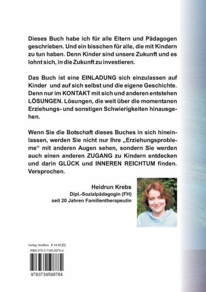 Das Buch ist eine EINLADUNG sich einzulassen auf Kinder - und auf sich selbst und die eigene Geschichte. Denn nur im KONTAKT mit sich und anderen entstehen LÖSUNGEN. Lösungen, die weit über die momentanen Erziehungs- und sonstigen Schwierigkeiten hinausgehen.