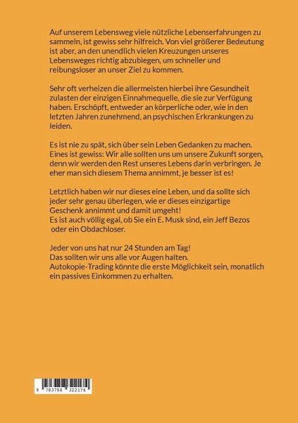 Auf unserem Lebensweg viele nützliche Lebenserfahrungen zu sammeln, ist gewiss sehr hilfreich. Von viel größerer Bedeutung ist aber, an den unendlich vielen Kreuzungen unseres Lebensweges richtig abzubiegen, um schneller und reibungsloser an unser Ziel zu kommen.Sehr oft verheizen die allermeisten hierbei ihre Gesundheit zulasten der einzigen Einnahmequelle, die sie zur Verfügung haben. Erschöpft, entweder an körperliche oder, wie in den letzten Jahren zunehmend, an psychischen Erkrankungen zu leiden.Es ist nie zu spät, sich über sein Leben Gedanken zu machen. Eines ist gewiss: Wir alle sollten uns um unsere Zukunft sorgen, denn wir werden den Rest unseres Lebens darin verbringen. Je eher man sich diesem Thema an-nimmt, je besser ist es! Letztlich haben wir nur dieses eine Leben, und da sollte sich jeder sehr genau überlegen, wie er dieses einzigartige Geschenk annimmt und damit umgeht!Zunächst einmal sollten wir uns überlegen, welche sinnvollen Wege es gibt, sich ein passives Einkommen aufzubauen, idealerweise vielleicht zwei oder mehr Einkommensarten auszuwählen. Im Nebenjob sich nach und nach unabhängig zu machen von nur einem sogenannten sozialversicherungspflichtigen Job, wäre ein Anfang! Passives Einkommen gibt Ihnen die Freiheit und auch die Macht zu wählen, was Sie genau mit ihrer Zeit machen möchten!Geld können Sie verdienen und nach Belieben ausgeben, ohne Frage, Sie können aber nur einmal Zeit verbrauchen. Ist die Zeit einmal vergangen, vergeht sie für immer. Selbst irgendeinen schönen Moment in der Zeit noch einmal zu erleben, egal wie einmalig dieser war, ist nicht möglich. Es ist auch völlig egal, ob Sie ein E. Musk sind, ein Jeff Bezos oder ein Obdachloser. Jeder von uns hat nur 24 Stunden am Tag! Das sollten wir uns alle vor Augen halten.Autokopie-Trading könnte die erste Möglichkeit sein, monatlich ein passives Einkommen zu erhalten.