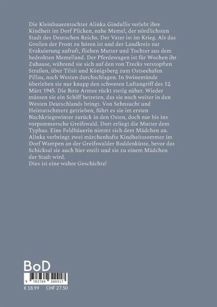 Die Kleinbauerntochter Alinka Gindullis verlebt ihre Kindheit im Dorf Plicken, nahe Memel, der nördlichsten Stadt des Deutschen Reichs. Der Vater ist im Krieg. Als das Grollen der Front zu hören ist und der Landkreis zur Evakuierung aufruft, fliehen Mutter und Tochter aus dem bedrohten Memelland. Der Pferdewagen ist für Wochen ihr Zuhause, während sie sich auf den von Trecks verstopften Straßen, über Tilsit und Königsberg zum Ostseehafen Pillau, nach Westen durchschlagen. In Swinemünde überleben sie nur knapp den schweren Luftangriff des 12. März 1945. Die Rote Armee rückt stetig näher. Wieder müssen sie ein Schiff betreten, das sie noch weiter in den Westen Deutschlands bringt. Von Sehnsucht und Heimatschmerz getrieben, führt es sie im ersten Nachkriegswinter zurück in den Osten, doch nur bis ins vorpommersche Greifswald. Dort erliegt die Mutter dem Typhus. Eine Feldbäuerin nimmt sich dem Mädchen an. Alinka verbringt zwei märchenhafte Kindheitssommer im Dorf Wampen an der Greifswalder Boddenküste, bevor das Schicksal sie auch hier ereilt und sie zu einem Mädchen der Stadt wird. Dies ist eine wahre Geschichte!
