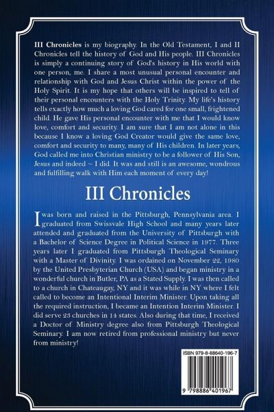 III Chronicles is my biography. In the Old Testament, I and II Chronicles tell the history of God and His people. III Chronicles is simply a continuing story of God's history in His world with one person, me. I share a most unusual personal encounter and relationship with God and Jesus Christ within the power of the Holy Spirit. It is my hope that others will be inspired to tell of their personal encounters with the Holy Trinity. My life's history tells exactly how much a loving God cared for one small, frightened child. He gave His personal encounter with me that I would know love, comfort and security. I am sure that I am not alone in this because I know a loving God Creator would give the same love, comfort and security to many, many of His children. In later years, God called me into Christian ministry to be a follower of His Son, Jesus and indeed ~ I did. It was and still is an awesome, wondrous and fulfilling walk with Him each moment of every day!