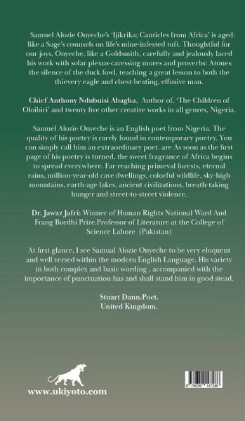 Samuel Alozie Onyeche's 'Ijikrika; Canticles from Africa' is aged: like a Sage's counsels on life's mine-infested tuft. Thoughtful for our joys, Onyeche, like a Goldsmith, carefully and jealously laced his work with solar plexus-caressing mores and proverbs: Atones the silence of the duck fowl, teaching a great lesson to both the thievery eagle and chest-beating, effusive man. Chief Anthony Ndubuisi Abagha, Author of, 'The Children of Oloibiri' and twenty five other creative works in all genres, Nigeria. Samuel Alozie Onyeche is an English poet from Nigeria. The quality of his poetry is rarely found in contemporary poetry. You can simply call him an extraordinary poet. are As soon as the first page of his poetry is turned, the sweet fragrance of Africa begins to spread everywhere. Far-reaching primeval forests, eternal rains, million-year-old cave dwellings, colorful wildlife, sky-high mountains, earth-age lakes, ancient civilizations, breath-taking hunger and street-to-street violence. Dr. Jawaz Jafri: Winner of Human Rights National Ward And Frang Bordhi Prize.Professor of Literature at the College of Science Lahore (Pakistan) At first glance, I see Samual Alozie Onyeche to be very eloquent and well versed within the modern English Language. His variety in both complex and basic wording , accompanied with the importance of punctuation has and shall stand him in good stead. Stuart Dann.Poet. United Kingdom.