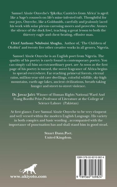Samuel Alozie Onyeche's 'Ijikrika; Canticles from Africa' is aged: like a Sage's counsels on life's mine-infested tuft. Thoughtful for our joys, Onyeche, like a Goldsmith, carefully and jealously laced his work with solar plexus-caressing mores and proverbs: Atones the silence of the duck fowl, teaching a great lesson to both the thievery eagle and chest-beating, effusive man. Chief Anthony Ndubuisi Abagha, Author of, 'The Children of Oloibiri' and twenty five other creative works in all genres, Nigeria. Samuel Alozie Onyeche is an English poet from Nigeria. The quality of his poetry is rarely found in contemporary poetry. You can simply call him an extraordinary poet. are As soon as the first page of his poetry is turned, the sweet fragrance of Africa begins to spread everywhere. Far-reaching primeval forests, eternal rains, million-year-old cave dwellings, colorful wildlife, sky-high mountains, earth-age lakes, ancient civilizations, breath-taking hunger and street-to-street violence. Dr. Jawaz Jafri: Winner of Human Rights National Ward And Frang Bordhi Prize.Professor of Literature at the College of Science Lahore (Pakistan) At first glance, I see Samual Alozie Onyeche to be very eloquent and well versed within the modern English Language. His variety in both complex and basic wording , accompanied with the importance of punctuation has and shall stand him in good stead. Stuart Dann.Poet. United Kingdom.