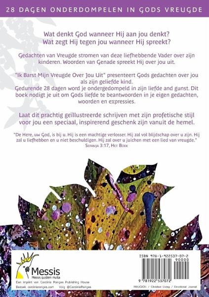Wat denkt God wanneer Hij aan jou denkt? Wat zegt Hij tegen jou wanneer Hij spreekt? Gedachten van Vreugde stromen van deze liefhebbende Vader over zijn kinderen. Woorden van Genade spreekt Hij over jou uit. "Ik Barst Mijn Vreugde Over Jou Uit" presenteert Gods gedachten over jou als zijn geliefde kind. Gedurende 28 dagen word je ondergedompeld in zijn liefde and gunst. Dit boek nodigt je uit om Gods liefde te beantwoorden in je eigen gedachten, woorden en expressies. Laat dit prachtig geïllustreerde schrijven met zijn profetische stijl voor jou een speciaal, inspirerend geschenk zijn vanuit de hemel. "De Here, uw God, is bij u. Hij is een machtige verlosser. Hij zal vol blijdschap over u zijn. Hij zal u liefhebben en u niet beschuldigen. Hij zal over u juichen met een lied van vreugde." (Sefanja 3:17, Het Boek)