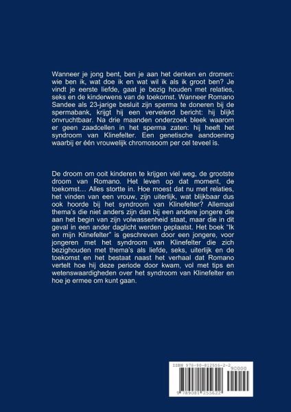 Wanneer je jong bent, ben je aan het denken en dromen: wie ben ik, wat doe ik en wat wil ik als ik groot ben? Je vindt je eerste liefde, gaat je bezig houden met relaties, seks en de kinderwens van de toekomst. Wanneer Romano Sandee als 23-jarige besluit zijn sperma te doneren bij de spermabank, krijgt hij een vervelend bericht: hij blijkt onvruchtbaar. Na drie maanden onderzoek bleek waarom er geen zaadcellen in het sperma zaten: hij heeft het syndroom van Klinefelter. Een genetische aandoening waarbij er één vrouwelijk chromosoom per cel teveel is. De droom om ooit kinderen te krijgen viel weg, de grootste droom van Romano. Het leven op dat moment, de toekomst... Alles stortte in. Hoe moest dat nu met relaties, het vinden van een vrouw, zijn uiterlijk, wat blijkbaar dus ook hoorde bij het syndroom van Klinefelter? In dit boek beschrijft Romano zijn ervaring met het syndroom van Klinefelter en geeft hij tips om hiermee om te kunnen gaan.