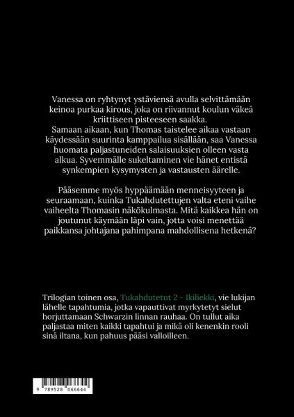 Vanessa on ryhtynyt ystäviensä avulla selvittämään keinoa purkaa kirous, joka on riivannut koulun väkeä kriittiseen pisteeseen saakka. Samalla, kun Thomas taistelee aikaa vastaan käydessään suurinta kamppailua sisällään, saa Vanessa huomata paljastuneiden salaisuuksien olleen vasta alkua. Syvemmälle sukeltaminen vie hänet entistä synkempien kysymysten ja vastausten äärelle. Pääsemme myös hyppäämään menneisyyteen ja seuraamaan, kuinka Tukahdutettujen valta eteni vaihe vaiheelta Thomasin näkökulmasta. Mitä kaikkea hän on joutunut käymään läpi vain, jotta voisi menettää paikkansa johtajana pahimpana mahdollisena hetkenä? Trilogian toinen osa, Tukahdutetut 2 - Ikiliekki, vie lukijan lähelle tapahtumia, jotka vapauttivat myrkytetyt sielut horjuttamaan Schwarzin linnan rauhaa. On tullut aika paljastaa miten kaikki tapahtui ja mikä oli kenenkin rooli sinä iltana, kun pahuus pääsi valloilleen.