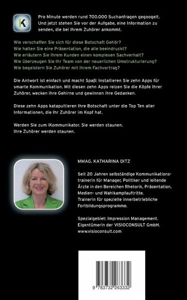 Pro Minute werden rund 700.000 Suchanfragen gegoogelt. Und jetzt stehen Sie vor der Aufgabe, eine Information zu senden, die bei Ihrem Zuhörer ankommt. Wie verschaffen Sie sich für diese Botschaft Gehör? Wie halten Sie in diesem Umfeld eine Präsentation, die alle umhaut? Wie erläutern Sie Ihrem Kunden einen komplexen Sachverhalt? Wie überzeugen Sie Ihr Team von der neuerlichen Umstrukturierung? Wie begeistern Sie Zuhörer mit Ihrem Fachvortrag?Die Antwort ist einfach und macht Spaß: Installieren Sie zehn Apps für smarte Kommunikation. Mit diesen zehn Apps reizen Sie die Köpfe Ihrer Zuhörer, wecken Ihre Gehirne und gewinnen Ihre Gedanken. Diese zehn Apps katapultieren Ihre Botschaft unter die Top Ten aller Informationen, die Ihr Zuhörer im Kopf hat. Werden Sie zum iKommunikator. Sie werden staunen. Ihre Zuhörer werden staunen.