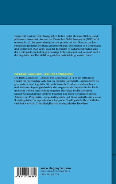 In der strukturalistisch geprägten Linguistik wird Ikonizität meist als zu vernachlässigendes Randphänomen beschrieben. Diese Einschätzung beruht jedoch vor allem auf Untersuchungen zur Lautsprache. Analysen des gebärdensprachlichen Lexikons belegen hingegen ein hohes Ausmaß an sprachlicher Ikonizität. Es ist deshalb fraglich, ob ihr Status als Randphänomen vor allem an die Grenzen des lautsprachlich genutzten Mediums geknüpft ist, und ob demgegenüber das visuell-gestische Medium einen begünstigenden Einfluss nimmt. Die vorliegende Untersuchung zur Rolle der Ikonizität in Grammatik und Syntax der deutschen Gebärdensprache (DGS) liefert neue Evidenz zur weiteren Aufklärung dieser Fragen. Die Analyse zeigt, dass der Ikonizität gegenüber der Arbitrarität in Gebärdensprachen eine mindestens gleichwertige Rolle zuzuweisen ist und dabei sowohl medienspezifische als auch für Lautsprachen geltende Ikonizitätsprinzipien herrschen. Die Ergebnisse sprechen gegen die Betrachtung der Ikonizität als sprachliches Randphänomen und für ihre Berücksichtigung in der linguistischen Theoriebildung.