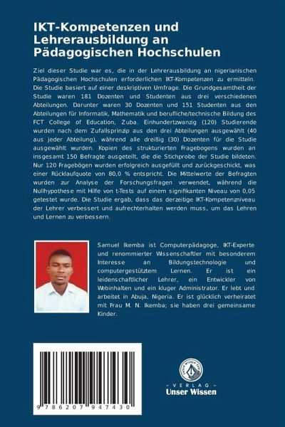 Ziel dieser Studie war es, die in der Lehrerausbildung an nigerianischen Pädagogischen Hochschulen erforderlichen IKT-Kompetenzen zu ermitteln. Die Studie basiert auf einer deskriptiven Umfrage. Die Grundgesamtheit der Studie waren 181 Dozenten und Studenten aus drei verschiedenen Abteilungen. Darunter waren 30 Dozenten und 151 Studenten aus den Abteilungen für Informatik, Mathematik und berufliche/technische Bildung des FCT College of Education, Zuba. Einhundertzwanzig (120) Studierende wurden nach dem Zufallsprinzip aus den drei Abteilungen ausgewählt (40 aus jeder Abteilung), während alle dreißig (30) Dozenten für die Studie ausgewählt wurden. Kopien des strukturierten Fragebogens wurden an insgesamt 150 Befragte ausgeteilt, die die Stichprobe der Studie bildeten. Nur 120 Fragebögen wurden erfolgreich ausgefüllt und zurückgeschickt, was einer Rücklaufquote von 80,0 % entspricht. Die Mittelwerte der Befragten wurden zur Analyse der Forschungsfragen verwendet, während die Nullhypothese mit Hilfe von t-Tests auf einem signifikanten Niveau von 0,05 getestet wurde. Die Studie ergab, dass das derzeitige IKT-Kompetenzniveau der Lehrer verbessert und aufrechterhalten werden muss, um das Lehren und Lernen zu verbessern.
