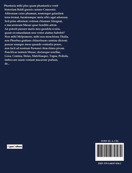 Phantasia mihi plus quam phantastica venit historiam Baldi grassis cantare Camoenis. Altisonam cuius phamam, nomenque gaiardum terra tremat, baratrumque metu sibi cagat adossum. Sed prius altorium vestrum chiamare bisognat, o macaroneam Musae quae funditis artem. An poterit passare maris mea gundola scoios, quam recomandatam non vester aiuttus habebit? Non mihi Melpomene, mihi non menchiona Thalia, non Phoebus grattans chitarrinum carmina dictent; panzae namque meae quando ventralia penso, non facit ad nostram Parnassi chiacchiara pivam. Pancificae tantum Musae, doctaeque sorellae, Gosa, Comina, Striax, Mafelinaque, Togna, Pedrala, imboccare suum veniant macarone poëtam, de...