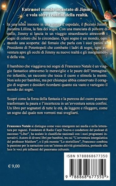 Entra nel mondo incantato di Jimmy e vola oltre i confini della realtà. In una notte insonne in una stanza d'ospedale, il piccolo Jimmy incontra Lillina, la fata dei sogni. Con una manciata di polvere di stelle, Jimmy si lancia in un viaggio straordinario attraverso i sogni di coloro che lo circondano. Ogni sogno è un mondo, ogni mondo una scoperta: dal fornaio che parla con i suoi panini al Presidente di Potentopoli che combatte i ladri di sogni, ogni avventura apre gli occhi di Jimmy su nuove realtà e gli insegnamenti della vita. Il bambino che viaggiava nei sogni di Francesco Natale è un viaggio fantastico attraverso le meraviglie e le paure dell'immaginario infantile, un racconto che tocca il cuore e stimola la mente. Non solo per bambini, ma per chiunque abbia conservato il coraggio di sognare e desideri ricordarsi quanto sia vasto e variegato il mondo dei sogni. Scopri come la forza della fantasia e la purezza del cuore possono trasformare la paura e l'incertezza in un'avventura senza confini. Un libro per sognatori di tutte le età, da leggere e rileggere, come un sogno dal quale non vorresti mai svegliarti. Acquista ora la tua copia su Amazon e immergiti in una serie di storie indimenticabili.