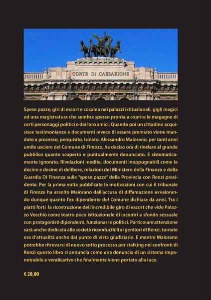 Spese pazze, giri di escort e cocaina nei palazzi istituzionali, gigli magici ed una magistratura che sembra spesso pronta a coprire le magagne di certi personaggi politici e dei loro amici. Quando poi un cittadino acquisisce testimonianze e documenti invece di essere premiato viene mandato a processo, perquisito, isolato. Alessandro Maiorano, per tanti anni umile usciere del Comune di Firenze, ha deciso ora di rivelare al grande pubblico quanto scoperto e puntualmente denunciato. E sistematicamente ignorato. Rivelazioni inedite, documenti inoppugnabili come le decine e decine di delibere, relazioni del Ministero della Finanza e della Guardia Di Finanza sulle "spese pazze" della Provincia con Renzi presidente. Per la prima volta pubblicate le motivazioni con cui il tribunale di Firenze ha assolto Maiorano dall'accusa di diffamazione avvalorando dunque quanto l'ex dipendente del Comune dichiara da anni. Tra i piatti forti la ricostruzione dell'incredibile giro di escort che vide Palazzo Vecchio come teatro poco istituzionale di incontri a sfondo sessuale con protagonisti dipendenti, funzionari e politici. Particolare attenzione sarà anche dedicata alle società riconducibili ai genitori di Renzi, tornate ora d'attualità anche dal punto di vista giudiziario. E mentre Maiorano potrebbe ritrovarsi di nuovo sotto processo per stalking nei confronti di Renzi questo libro si annuncia come una denuncia di un sistema impenetrabile e vendicativo che finalmente viene portato alla luce.