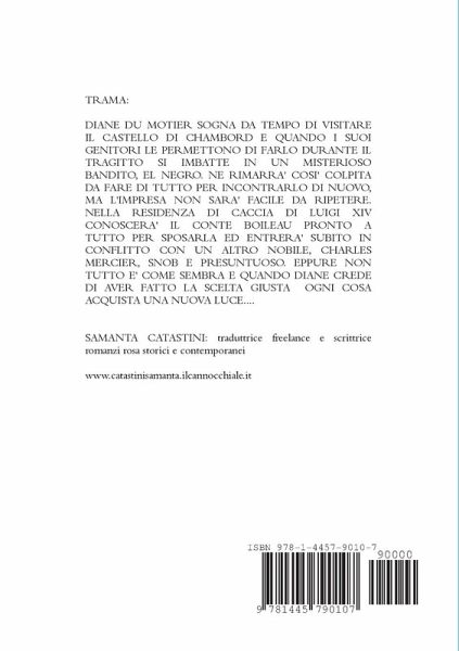 IL BANDITO MISTERIOSO Diane du Motier sogna da tempo di visitare il castello di Chambord e quando riesce a raggiungerlo durante il tragitto si imbatte in un misterioso bandito. El Negro è il nome che il popolo gli ha conferito per il colore scuro con cui si veste e per il fatto che parla spagnolo con un accento francese. La ragazza farà di tutto per incontrarlo di nuovo anche mettere a repentaglio la sua stessa vita. Quell'incontro le cambierà l'esistenza e le aprirà gli occhi sulle tristi condizioni di vita dei poveri contadini. Durante le feste a castello conoscerà il conte Boileau pronto a sposarla mentre entrerà in aperto conflitto con monsieur Mercier, un aristocratico pieno di sé. Ma non tutto è quello che sembra.... -------------------------------------------------- CON L'ACQUISTO O IL DOWNLOAD DI QUESTO ROMANZO DONATE 50 CENTESIMI ALL'ASSOCIAZIONE IHP PER LA CURA E LA SALVEZZA DI TUTTI GLI EQUINI MALTRATTATI http://www.horseprotection.it/ GRAZIE!