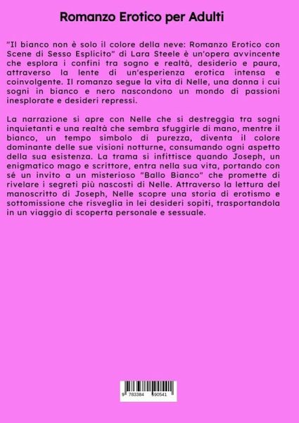 "Il bianco non è solo il colore della neve: Romanzo Erotico con Scene di Sesso Esplicito" di Lara Steele è un'opera avvincente che esplora i confini tra sogno e realtà, desiderio e paura, attraverso la lente di un'esperienza erotica intensa e coinvolgente. Il romanzo segue la vita di Nelle, una donna i cui sogni in bianco e nero nascondono un mondo di passioni inesplorate e desideri repressi. La narrazione si apre con Nelle che si destreggia tra sogni inquietanti e una realtà che sembra sfuggirle di mano, mentre il bianco, un tempo simbolo di purezza, diventa il colore dominante delle sue visioni notturne, consumando ogni aspetto della sua esistenza. La trama si infittisce quando Joseph, un enigmatico mago e scrittore, entra nella sua vita, portando con sé un invito a un misterioso "Ballo Bianco" che promette di rivelare i segreti più nascosti di Nelle. Attraverso la lettura del manoscritto di Joseph, Nelle scopre una storia di erotismo e sottomissione che risveglia in lei desideri sopiti, trasportandola in un viaggio di scoperta personale e sessuale.