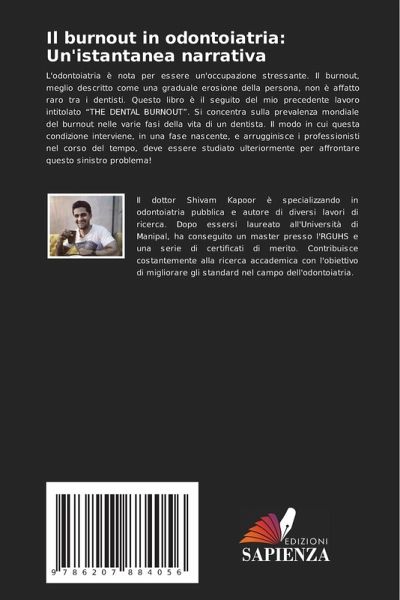 L'odontoiatria è nota per essere un'occupazione stressante. Il burnout, meglio descritto come una graduale erosione della persona, non è affatto raro tra i dentisti. Questo libro è il seguito del mio precedente lavoro intitolato ¿THE DENTAL BURNOUT¿. Si concentra sulla prevalenza mondiale del burnout nelle varie fasi della vita di un dentista. Il modo in cui questa condizione interviene, in una fase nascente, e arrugginisce i professionisti nel corso del tempo, deve essere studiato ulteriormente per affrontare questo sinistro problema!