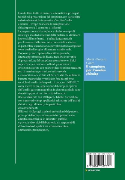 Questo volume illustra le principali tecniche di preparazione del campione con particolare enfasi sulle tecniche innovative e sui sistemi on-line che mirano a ridurre il tempo di analisi, la manipolazione del campione e il consumo di solventi. L'analisi chimica prevede infatti generalmente una fase di preparazione del campione, che ha lo scopo di isolare gli analiti di interesse dalla matrice ed eliminare i potenziali interferenti prima della determinazione analitica finale. Il testo è arricchito da numerosi esempi applicativi nel settore dell'analisi chimica degli alimenti e in particolare dei contaminanti. Il volume è rivolto, oltre che a studenti universitari, dottorandi e ricercatori, anche ai tecnici di laboratorio che devono acquisire conoscenze e competenze per la preparazione del campione per l'analisi chimica nel settore alimentare, ambientale e farmaceutico.