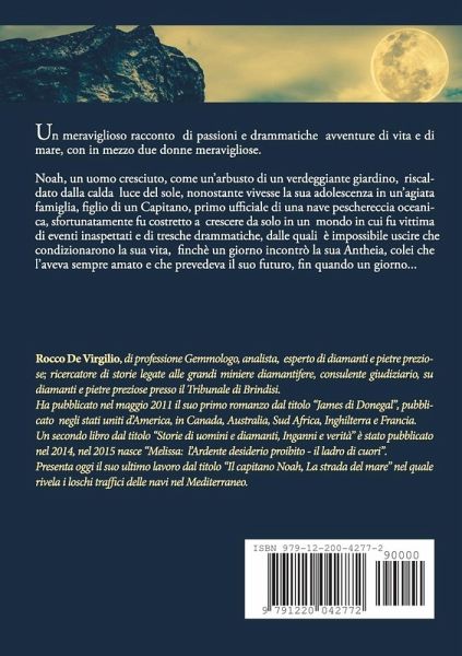Appassionato di racconti di vita marinara ed esperto skipper navigatore, De Virgilio ha deciso di trasformare in romanzo la vicenda del capitano cui ha messo il nome fittizio di Noah Cariakis, partito da Cipro come giovane clandestino a bordo di un peschereccio e passato attraverso tragedie e sventure tutte dipanatesi fra le onde. La perdita dei genitori, la miseria, gli anni come pescatore con l'amato zio lo formano nel carattere ma non riescono a proteggerlo dalle contraddizioni morali del genere umano: la sua prima e tanto agognata esperienza come comandante lo vedrà coinvolto inconsapevolmente in un commercio criminale che alimenterà un sottile senso di sfiducia nel sogno pulito di somigliare all' integerrimo padre e nutrirà il desiderio di appagare invece le proprie aspirazioni di fama e ricchezza.