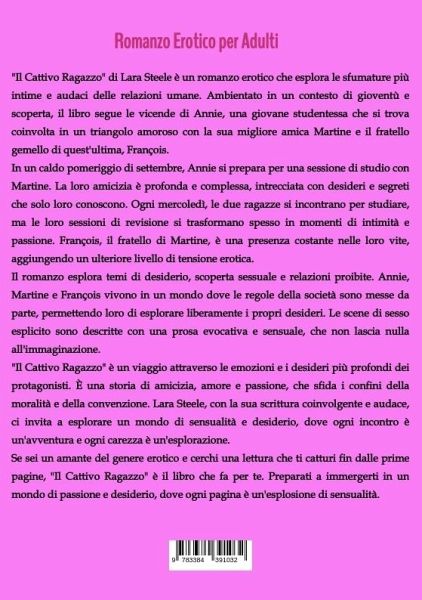 "Il Cattivo Ragazzo" di Lara Steele è un romanzo erotico che esplora le sfumature più intime e audaci delle relazioni umane. Ambientato in un contesto di gioventù e scoperta, il libro segue le vicende di Annie, una giovane studentessa che si trova coinvolta in un triangolo amoroso con la sua migliore amica Martine e il fratello gemello di quest'ultima, François.In un caldo pomeriggio di settembre, Annie si prepara per una sessione di studio con Martine. La loro amicizia è profonda e complessa, intrecciata con desideri e segreti che solo loro conoscono. Ogni mercoledì, le due ragazze si incontrano per studiare, ma le loro sessioni di revisione si trasformano spesso in momenti di intimità e passione. François, il fratello di Martine, è una presenza costante nelle loro vite, aggiungendo un ulteriore livello di tensione erotica.Il romanzo esplora temi di desiderio, scoperta sessuale e relazioni proibite. Annie, Martine e François vivono in un mondo dove le regole della società sono messe da parte, permettendo loro di esplorare liberamente i propri desideri. Le scene di sesso esplicito sono descritte con una prosa evocativa e sensuale, che non lascia nulla all'immaginazione."Il Cattivo Ragazzo" è un viaggio attraverso le emozioni e i desideri più profondi dei protagonisti. È una storia di amicizia, amore e passione, che sfida i confini della moralità e della convenzione. Lara Steele, con la sua scrittura coinvolgente e audace, ci invita a esplorare un mondo di sensualità e desiderio, dove ogni incontro è un'avventura e ogni carezza è un'esplorazione.Se sei un amante del genere erotico e cerchi una lettura che ti catturi fin dalle prime pagine, "Il Cattivo Ragazzo" è il libro che fa per te. Preparati a immergerti in un mondo di passione e desiderio, dove ogni pagina è un'esplosione di sensualità.