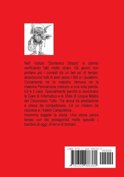 Nell'Istituto "Domenico Strazio" si stanno verificando fatti molto strani. Gli alunni non portano più i compiti da un bel po' di tempo: asseriscono tutti di aver perso i libri e i quaderni. Ovviamente né la maestra Verruca né la maestra Pennarossa credono a una sola parola. Ed è il caos. Specialmente perché si avvicinano le Gare di Artematica e le Sfide di Lingua Madre e Lingua Padre del Circondario Tutto. Tra ansia da prestazione e stress da competizione, c'è anche un mistero da risolvere e i fratelli Campofelice...Insomma leggete la storia. Una storia senza tempo con protagonisti molto speciali: i bambini di oggi, di ieri e di domani.