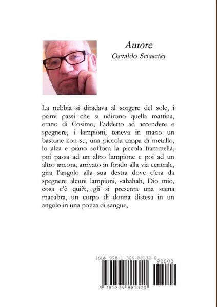 La nebbia si diradava al sorgere del sole, i primi passi che si udirono quella mattina, erano di Cosimo, l'addetto ad accendere e spegnere, i lampioni, teneva in mano un bastone con su, una piccola cappa di metallo, lo alza e piano soffoca la piccola fiammella, poi passa ad un altro lampione e poi ad un altro ancora, arrivato in fondo alla via centrale, gira l'angolo alla sua destra dove c'era da spegnere alcuni lampioni, ahahah, Dio mio, cosa c'è qui?, gli si presenta una scena macabra, un corpo di donna distesa in un angolo in una pozza di sangue,